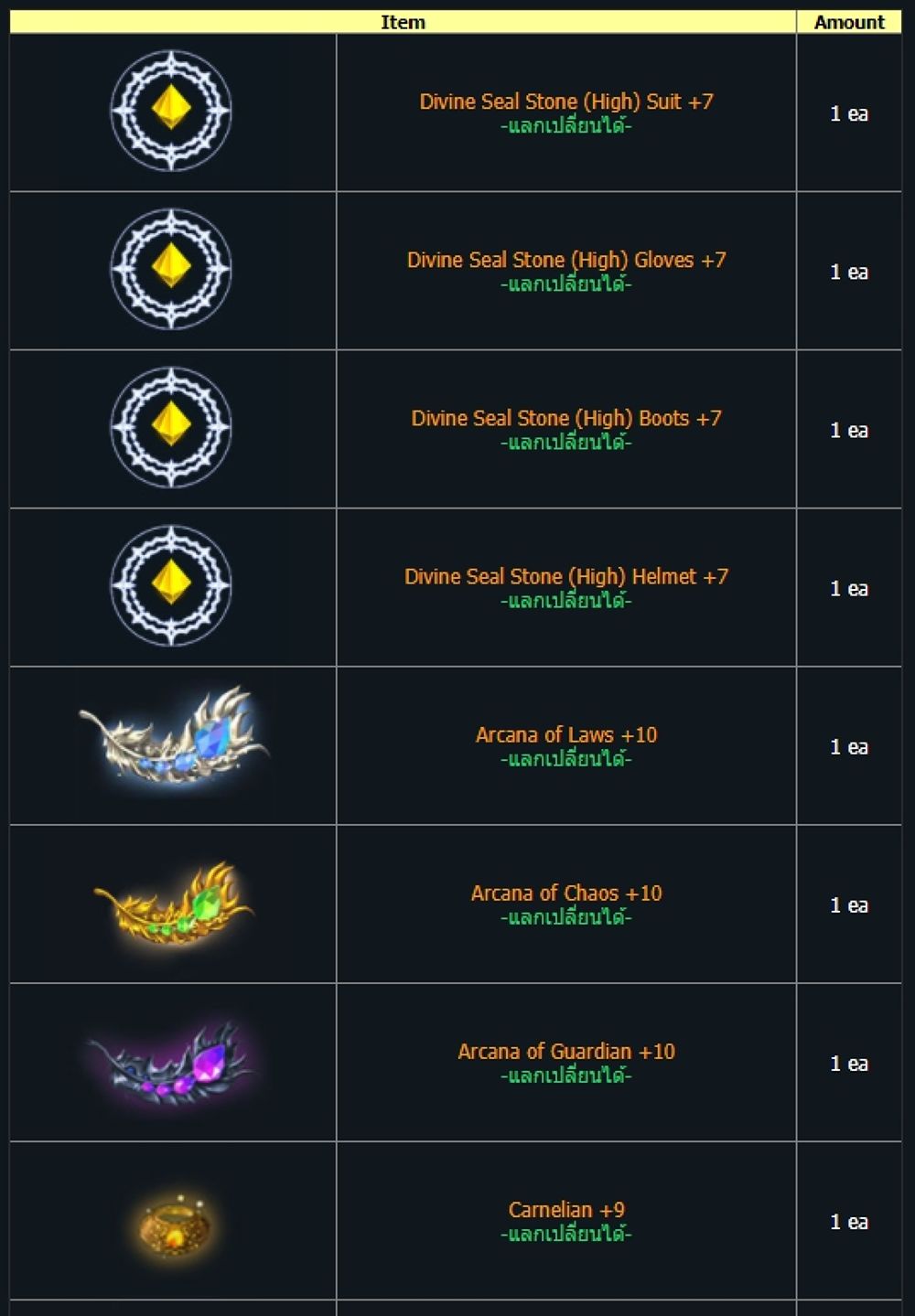 Divine Seal Stone (High) +7, Arcana of Laws +10, Arcana of Chaos +10, Arcana of Guardian +10, Carnalian +9