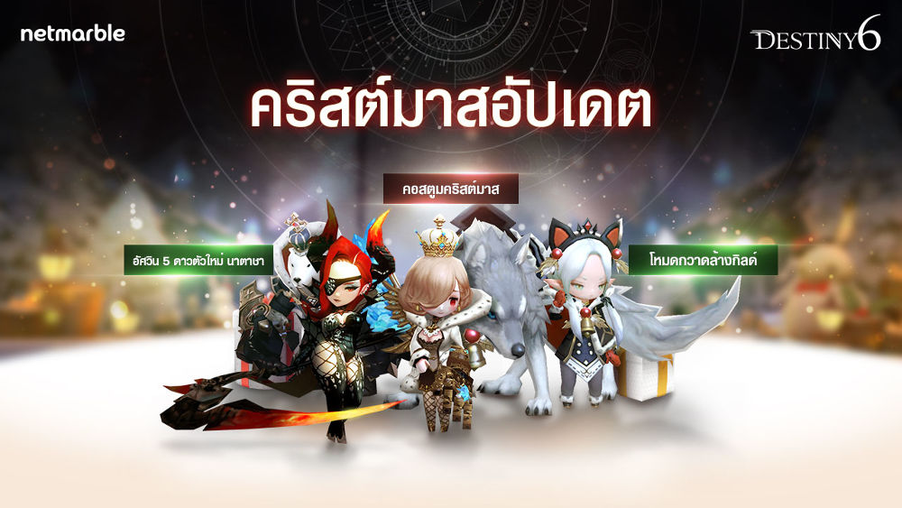 และในช่วงนี้ที่หน้าล็อบบี้ของเกมและคอสตูมก็จะมีการเปลี่ยนเป็นธีมคริสต์มาสให้เข้าบรรยากาศ และจะมีการจัดกิจกรรมเช็คชื่อในระหว่างวันที่ 21 – 26 ธ.ค. ที่ผู้เล่นจะได้รับรางวัลในเกม Destiny 6 กันชนิดจุใจทุกวัน
