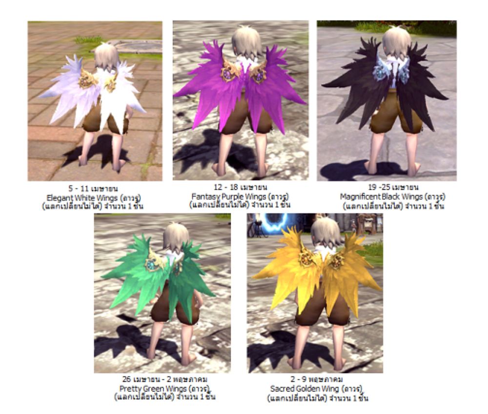 เมษายนนี้ไม่นกแน่นอน พบกับ คอสตูมสุดพิเศษส่วนปีก ที่มีเฉพาะช่วงนี้เท่านั้น โดยทางทีมงานจะสุ่มแจกให้กับผู้เล่น 100 คน ที่ทำการ Login เข้าเกมเป็นเวลาอย่างน้อย 3 วัน ใน 1 สัปดาห์ โดยจะแจกสัปดาห์ละ 1 ครั้ง ครั้งละ 100 คน ตั้งแต่วันนี้ - 9 พฤษภาคม 2560เท่านั้น โดยมีรายละเอียดส่วนปีก ดังนี้