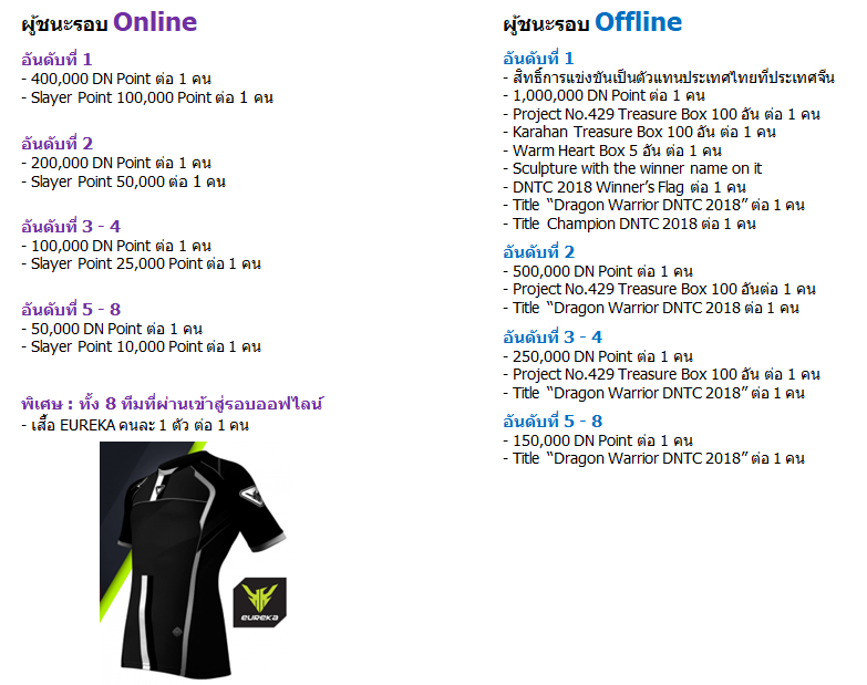 * ผู้เข้าแข่งขันในรอบ Online 8 ทีมสุดท้าย จะได้ไปแข่งต่อในรอบ OFFLINE ในวันที่ 30 กันยายน 2561 (สถานที่การแข่งขันจะประกาศให้ทราบอีกครั้งหนึ่ง) เพื่อค้นหาแชมเปี้ยน DNTC 2018 และได้ไปแข่งต่อในงาน DWC 2018 ที่ประเทศจีน