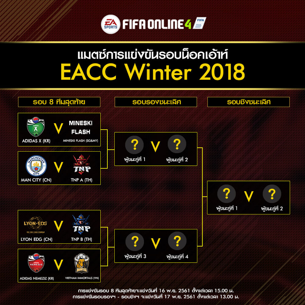 สิ้นสุดไปแล้วกับการแข่งขัน EACC Winter 2018 ในรอบแบ่งกลุ่ม กับผลงานที่ยอดเยี่ยมของทีมชาติไทยที่สามารถกอดคอกันเข้ารอบน็อคเอ้าท์ไปได้ โดยในรอบน็อคเอ้าท์จะจัดขึ้นที่ BEXCO Auditorium ณ เมืองปูซาน ที่ประเทศเกาหลีใต้ ในวันที่ 16-17 พฤศจิกายน 2561