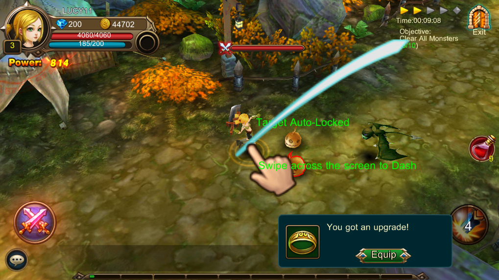 เพื่อนๆสามารถที่จะสไลด์หน้าจอเพื่อหลบการโจมตี หรือทัชหน้าจอเพื่อโจมตีหรือใช้สกิลได้