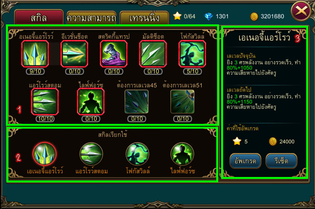 1.คือ สกิลที่เรามี เราจะได้รับสกิลใหม่ๆเมื่อมีระดับเลเวลมากขึ้น