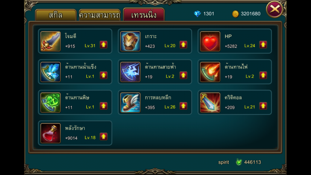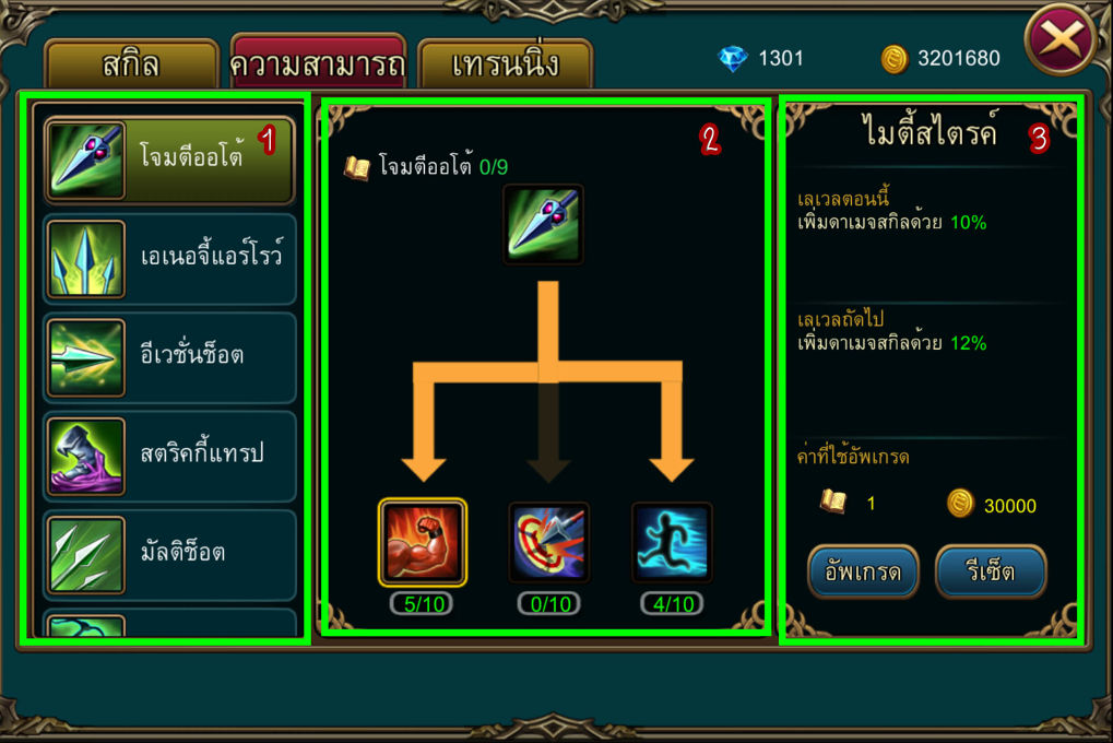1. รายชื่อสกิล  เราสามารถเลือกสกิลที่ต้องการอัพเกรดได้