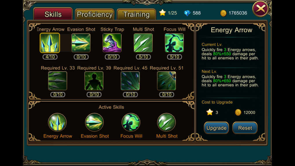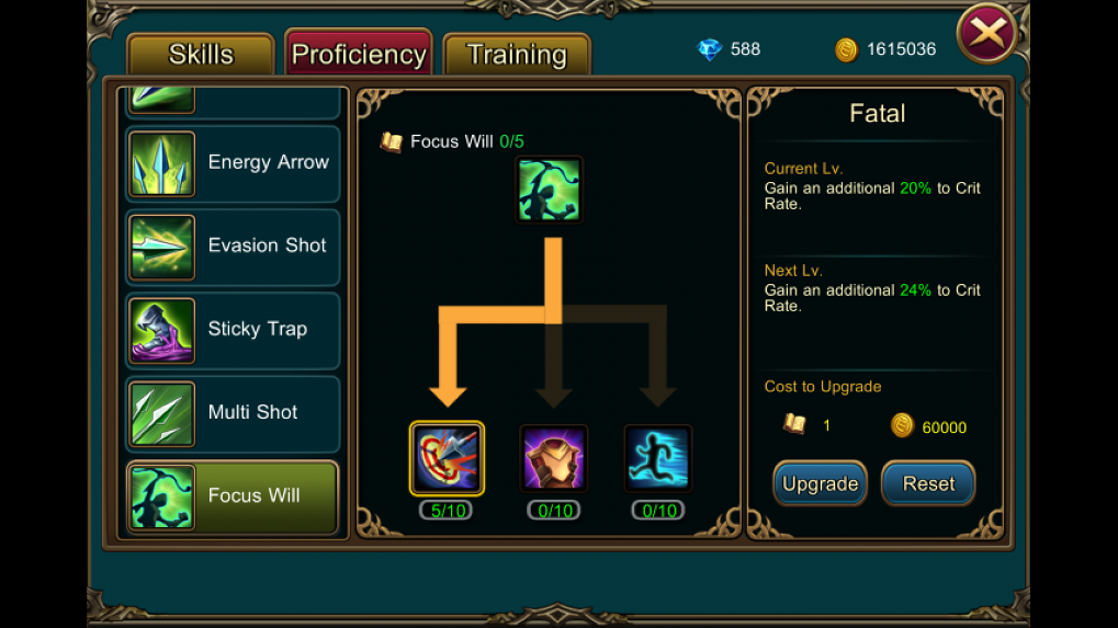 ในส่วนนี้จะคล้ายๆกับระดับสกิล แต่จะเป็นเหมือนโบนัสกับผลพิเศษของท่าอาทิเช่นเพิ่มโอกาสคริติตอลเมื่อใช้สกิลโดน หรือ ลดความเร็วการเคลื่อนที่ของศัตรู เป็นต้น โดยเราสามารถเลือกได้ 3 สายต่อสกิล โดยพ้อยเริ่มต้นนั้นจะได้มา 5 ทุกสกิล และการอัพจะมีค่าใช้จ่ายเล็กน่้อย ในส่วนของการหาแต้มเพิ่มนั้นทางเราจะมาอัพเดตวิธีกันในบทความเจาะลึกครั้งถัดๆไป