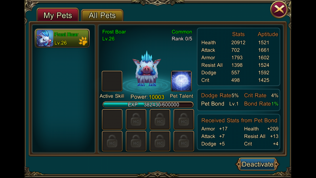 ในเกม Eden เนี่ยสัตว์เลี้ยงเป็นอะไรที่สำคัญมากโดยเแพาะในช่วงแรกต้องขอบอกไว้ก่อนเลยว่าบางทีสัตว์เลี้ยงมีค่าพลัง(power) มากกว่าตัวคนเล่นเสียอีก TT เรียกได้ว่าเป็นผู้ช่วยที่ขาดไม่ได้สำหรับเกมนี้เลยทีเดียว นอกจากนั้นยังเพิ่มค่าสเตตัสให้กับเราอีกด้วยนะ ซึ่งการจะได้รับสัตว์เลี้ยงใหม่ๆนั้นเราจะต้องสะสม Pet Shards ซึ่งได้จากด่านต่างๆ หรือจากกิจกรรมต่างๆนั่นเอง ในส่วนระบบฝึกสัตว์จะมีรายละเอียดปลีกย่อยค่อนข้างมากเดี๋ยวกบจะนำมาเสนอในเร้วๆนี้ครับ