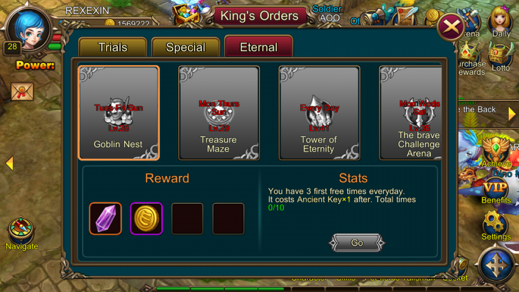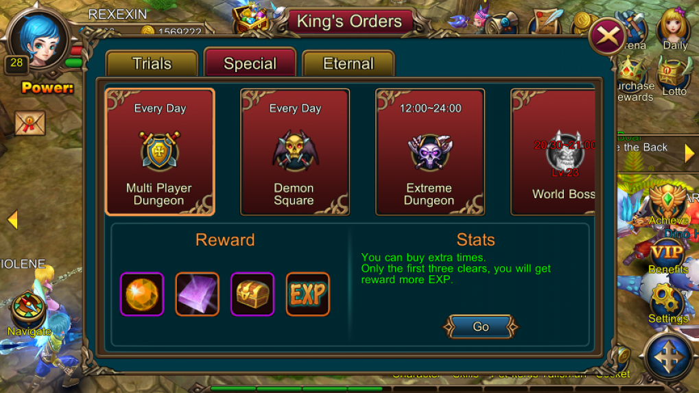 เราสามารถลงดันเจี้ยนพิเศษต่าๆทั้งหลายได้หากทำเงื่อนไขครบเช่น Trials Dungeon ที่จะลงได้วันละครั้งหากถึงเลเวล 29 หรือ Special Dungeon ต่าง อาทิเช่น Multiplay ที่เล่นพร้อมกับเพื่อนๆ, Demon Square, Extreme Dungeon เป็นต้นซึ่งจะมีรางวัลที่แตกต่างกันออกไป โดยจะเจาะลึกแต่ละดันเจี้ยนให้เพื่อนๆทราบในภายหลังครับ