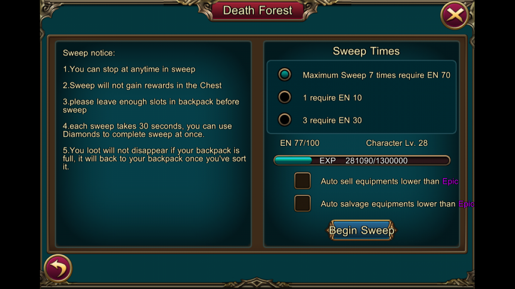 ระบบเอาใจคนที่เวลาเล่นไม่ค่อยเยอะโดยเราสามารถให้บอทเล่นแทนได้แต่จะมีข้อเสียคือเราอาจจะได้รับไอเทมน้อยกว่าการเล่นเอง โดยเราจะกดได้ในหน้าเลือกด่านปุ่มจะอยู่ด้านล่าง Enter หลังจากเปิดแล้วเราจะสามารถเลือกให้ขายไอเทมที่ได้มาหรือจะนำไปย่อยได้เลย   โดยเราสามารถเลือกได้ว่าจะ Sweep จน Energy หมดหรือตามจำนวนครั้งที่มีให้เลือก