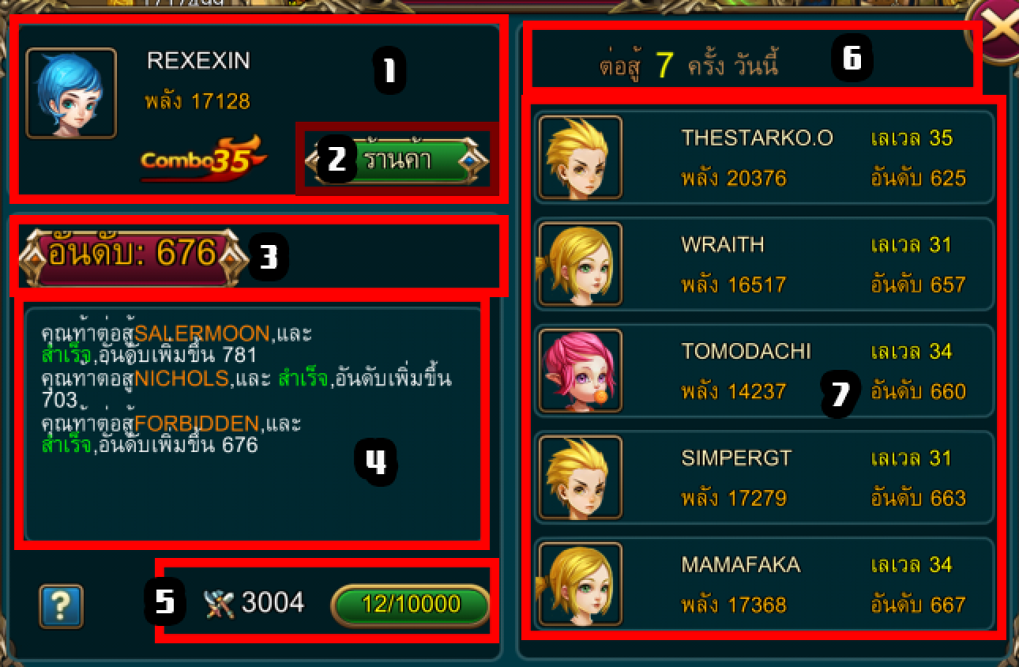 6.จำนวนครั้งที่สามารถต่อสู้ได้ที่เหลือ(ต่อวัน) ซึ่งเราจะเข้ามาท้าสู้ผู้อื่นได้วันละ 10 ครั้ง
