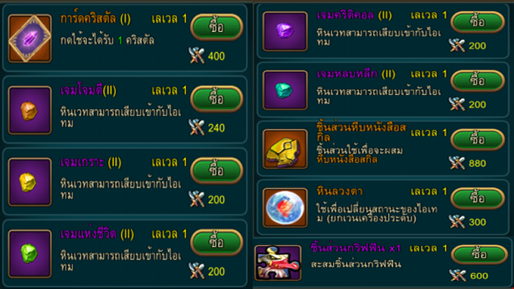 โดยส่วนตัวแล้วในระยะแรกๆการแลกเจมต่างๆมาเพื่อใส่ในอาวุธเป็นวิธีที่ไม่เลวเลยโดยเราสามารถหลอมเจมระดับสูงขึ้นได้โดยใช้เจมชนิดเดียวกัน 3 เม็ดซึ่งการสะสมให้ได้เจมระดับสูงไม่ใช่เรื่องยากเลยหากเราลงอารีน่าอย่างสม่ำเสมอและมีอันดับดีๆในระดับนึงเราจะได้แต้มอารีน่าทุกวันอีกด้วย ทำให้หาแต้มมาแลกของไม่ยากเท่าไหร่ หากเราพอใจกับเจมแล้วสิ่งต่อมาที่จะแนะนำคือหินลวงตาเอาไว้รีสถานะของไอเทมเพื่อให้ได้ สถานะโบนัสที่พอใจครับ ^_^