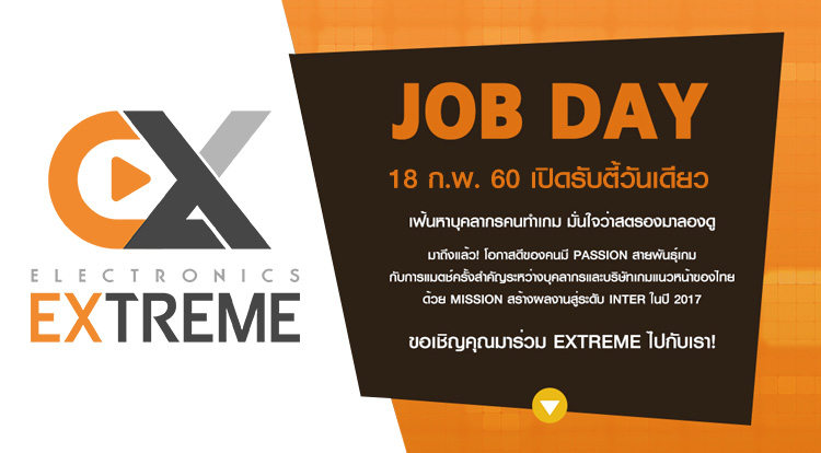 เปิดรับสมัครประจำปี 2560! เฟ้นหาบุคลากรคนทำเกม ร่วมงานกับบริษัท Electronics Extreme หนึ่งในบริษัทเกมชั้นแนวหน้าของไทย ผู้ให้บริการเกม Infestation, Ragnarok Online, Dragonica และ Battle Carnival เพื่อรองรับการเติบโตอย่างต่อเนื่องทั้งในส่วนของเกม PC รวมไปถึงแพลตฟอร์มเกมมือถือในปีนี้ เปิดรับสมัครทุกตำแหน่งงาน วันเสาร์ที่ 18 กุมภาพันธ์ 2560 วันเดียวเท่านั้น ขอเชิญคุณมาร่วม Extreme ไปกับพวกเรา!