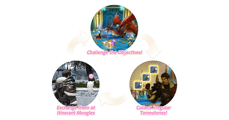 สำหรับการรับทำทำเควสต่างๆ หรือไม่ก็เล่นโหมด PvP ล้วนได้รับ Irregular Tomestones of Mythology (คะแนน) แตกต่างกันไป เพียงแต่ตัวเกมจะไม่มอบสิ่งเหล่านี้ให้ก็ต่อลงดันเจี๊ยนด้วย Undersized Party [Option] และ Joining a Party in Progress โดยมีเนื้อหาดังต่อนี้● 10 Irregular Tomestones of Mythology (คะแนน) : ดันเจี๊ยน The Praetorium เงื่อนไขการเข้าร่วมต้องเลเวล 50 ขึ้นไปเท่านั้น● 7 Irregular Tomestones of Mythology (คะแนน) : ดันเจี๊ยน Castrum Meridianum เงื่อนไขการเข้าร่วมต้องเลเวล 50 ขึ้นไปเท่านั้น● 5 Irregular Tomestones of Mythology (คะแนน) : โหมด PvP - The Borderland Ruins (Secure), Seal Rock (Seize), The Fields of Glory (Shatter) และ Hidden Gorge เงื่อนไขการเข้าร่วมต้องเลเวล 30 ขึ้นไปเท่านั้น● 3 Irregular Tomestones of Mythology (คะแนน) : ดันเจี๊ยน The Labyrinth of the Ancients, Syrcus Tower และ The World of Darkness เงื่อนไขการเข้าร่วมต้องเลเวล 50 ขึ้นไปเท่านั้น