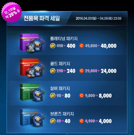 ลดราคาลง 20% ในช่วง 1 สัปดาห์แรกของเดือน ตั้งแต่วันที่ 2016.04.01 ~ 2016.04.09 โดยสามารถใช้ทั้ง FC coin หรือ coin ซื้อได้ รายละเอียดมีดังนี้