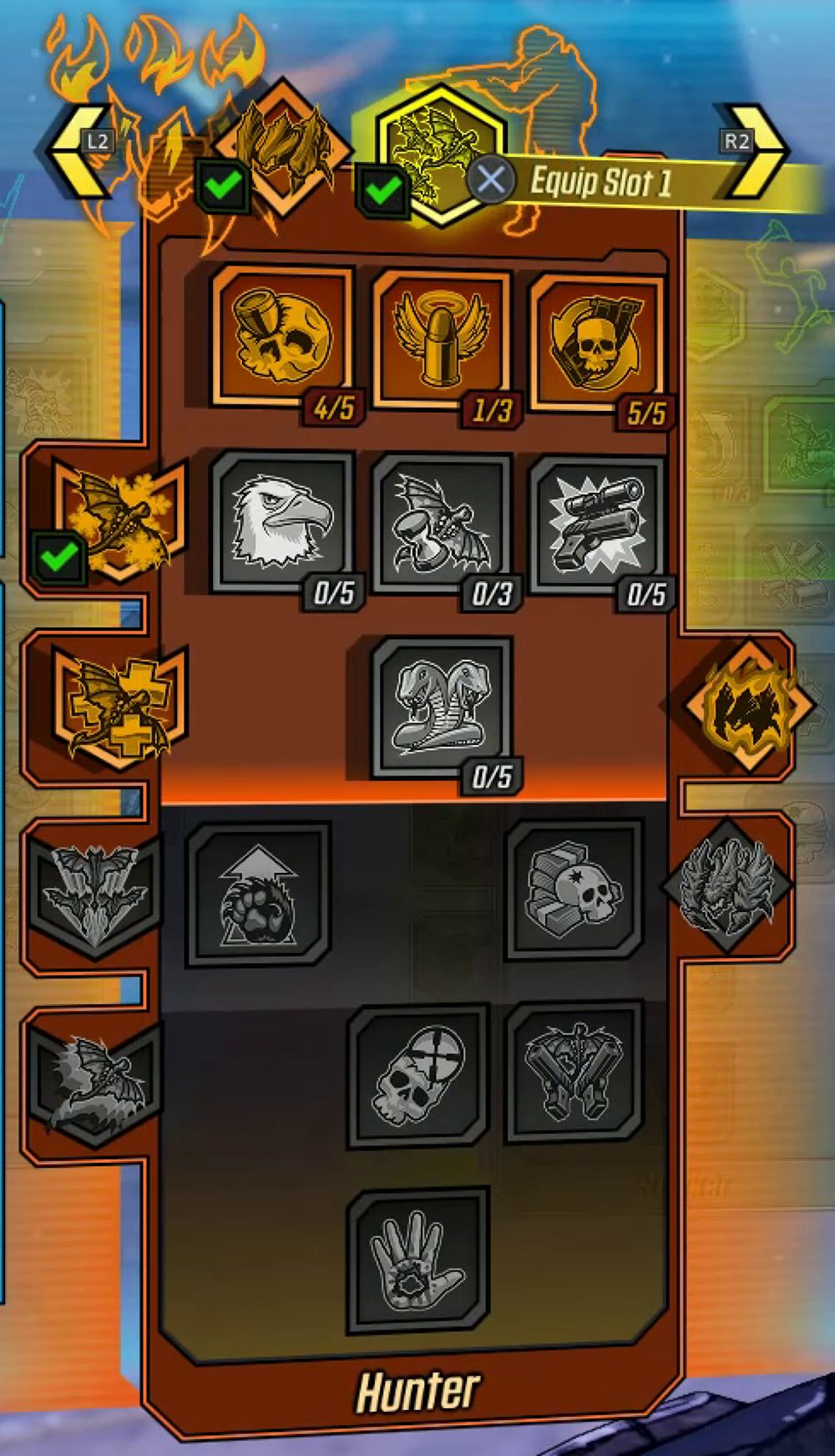 The Most Dangerous Game - เมื่อสังหาร Badass หรือศัตรูที่แข็งแกร่งกว่า จะเพิ่มความเสียหายแบบคริติคอล ความแรงของปืน และการควบคุมปืนเป็นระยะเวลาหนึ่ง และยังได้รับเงินรางวัลพิเศษด้วย