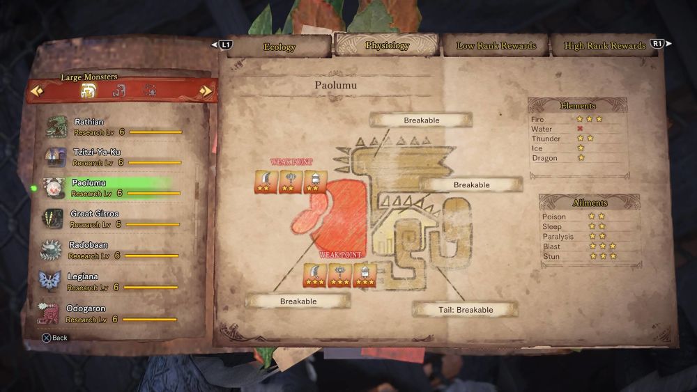 จุดอ่อนของ Paolumu จะอยู่ส่วนหัวเป็นหลัก ซึ่งอาวุธทุกประเภทสามารถสร้างความเสียหายได้อย่างรุนแรงเท่าๆ กันเลยค่ะ โดยส่วนที่สามารถทำลายได้มีทั้งหมด 4 ส่วนด้วยกันได้แก่ หัว, หาง, ปีก และ บริเวณลำตัว ส่วนเรื่องแพ้ธาตุ Paolumu เป็นมอนสเตอร์ที่แพ้ธาตุไฟอย่างรุนแรงเรียกว่าโดนทีร้องเป็นน้องแมวกันเลยทีเดียว ส่วนสถานะผิดปกติไม่ต้องบอกก็พอจะเดาออกใช่ไหมคะ!? ระเบิดจะสร้างความเสียหายได้รุนแรงแถมยังมีโอกาสติดสถานะสตั๊นท์ได้หนักที่สุดอีกด้วยค่ะ สุดท้ายมอนสเตอร์ตัวนี้สามารถจับเป็นได้ทั้งแบบ Low Rank และ High Rank การจับเป็นจะทำให้มีโอกาสได้รับไอเท็มระดับสูงมากกว่าการฆ่าปกติอีกด้วย