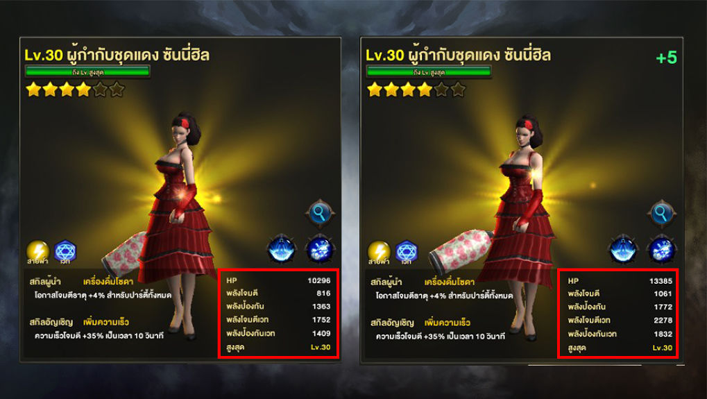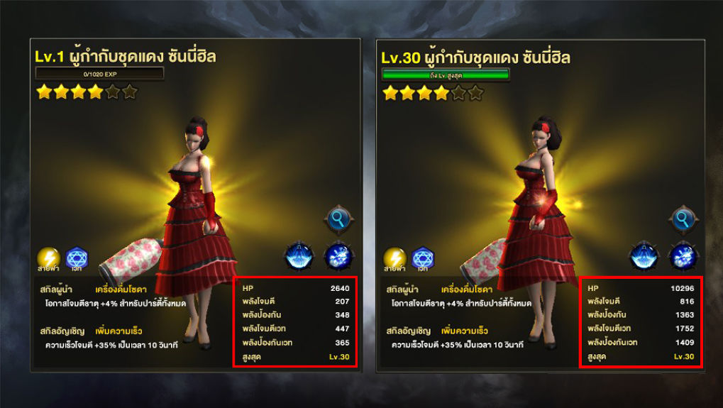 จากค่าสเตตัสดังที่เห็นในรูปนั้นเพื่อนๆจะเห็นได้ว่า จากเลเวล 1 ไปเลเวล30 ค่าสเตตัสนั้นจะแตกต่างกันเยอะมาก และอีกข้อนึงคือระดับดาวของฮีโร่ก็มีผลกับค่าสเตตัสมากด้วยนะ เพราะว่านอกจากจะให้ค่าสเตตัสที่สูงตามระดับดาวอยู่แล้ว มันยังปลดลิมิตเลเวลให้เพิ่มขึ้นด้วย อย่าง ฮีโร่ 4ดาว ก็มีเลเวลตันที่ 30 แต่เมื่อยกระดับฮีโร่เป็น 5ดาว เลเวลก็จะตันที่ 35 ประมาณนี้ ส่วน 6 ดาวตัน 40 นะจร๊ะ!!