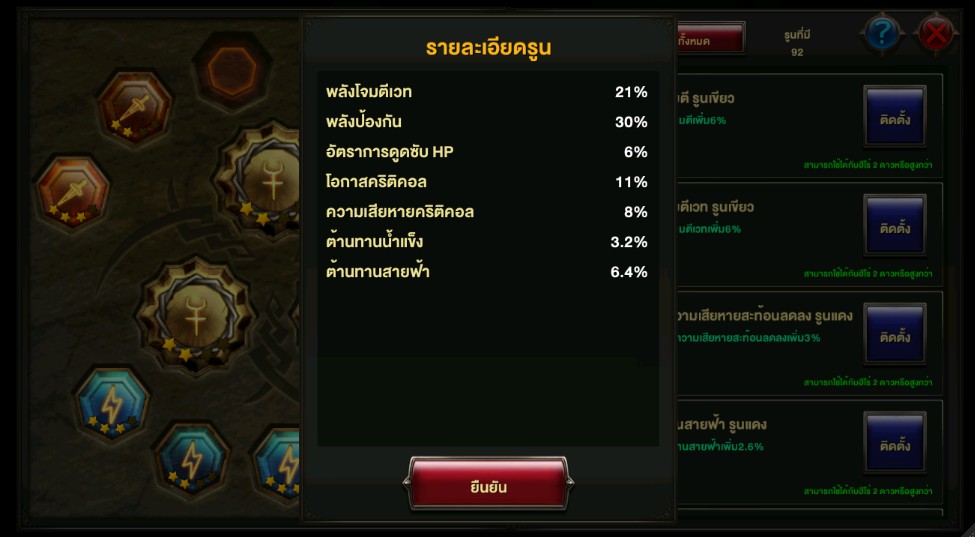 ในส่วนนี้คือรายละเอียดรูน เราสามารถกดดูได้ว่า เราใส่ออฟชั่นรูนอะไรอยู่บ้าง ซึ่งเกมจะรวมเปอร์เซ็นออฟชั่นที่ใส่มาให้เลย