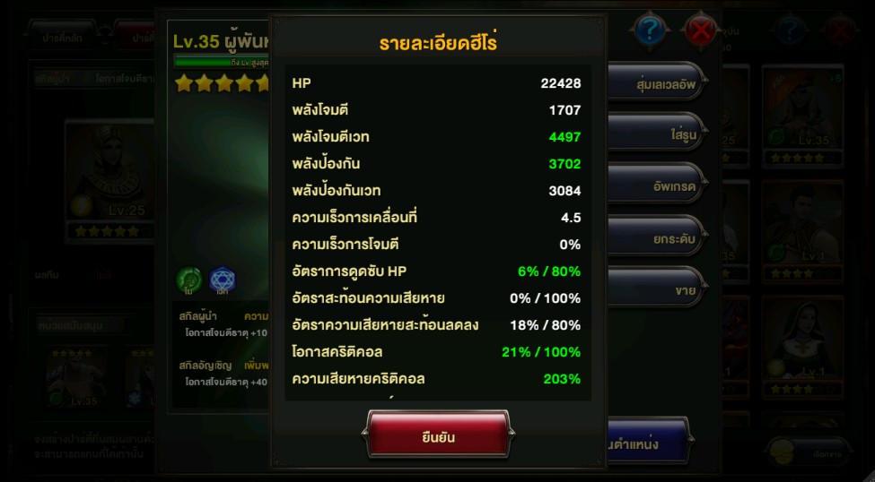 ในส่วนรายละเอียดฮีโร่ค่อนข้างสำคัญในการวางแผนการเล่นมาก เพราะมันจะบอกว่าฮีโร่เราสเตตัสเท่าไหร่ และตัวเลขสีเขียวๆนั่นคือค่าสเตตัสที่ได้จากรูนหากเราใส่รูนออฟชั่นไหนไปมันก็จะมาแสดงตรงนี้นั่นเอง
