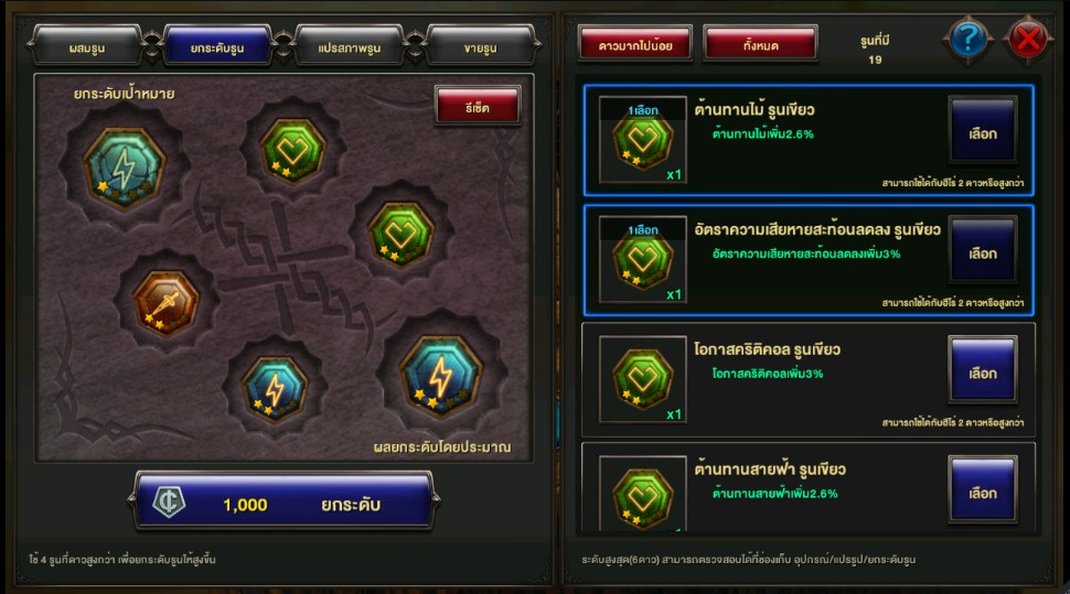 การยกระดับ ก็คือการเพิ่มดาวของรูนชิ้นนั้นให้สูงขึ้นนั่นเอง ในส่วนนี้จะเหมาะกับผู้ที่ต้องการเพิ่มดาวให้กับรูนโดยไม่สูญเสียออฟชั่นเดิมของมันไป แต่มีข้อเสียอยู่คือการจะยกระดับจะต้องใช้รูนที่มีดาวเท่ากับรูนผลลัพท์ที่จะได้มา อย่างเช่น ในรูปเราต้องการยกระดับรูน 1 ดาว ออฟชั่นดูดเลือด เราก็ต้องเลือกรูน 2 ดาว 4 อัน มาเป็นวัตถุดิบ เพื่อยกรับรูน 1 ดาวให้ไป 2 ดาวแบบออฟชั่นเดิมดูดเลือด นั่นเอง!! เสียตรงที่มันสิ้นเปลืองรูนไปหน่อย แต่มันจะดีมากในช่วงหลังๆ เพราะยังไงมันก็ดีกว่าไปนั่งสุ่มรูนใหม่ล่ะนะ มีรูนดีๆออฟดีๆแล้วจะไปนั่งสุ่มออฟใหม่ทำไมล่ะจริงมั้ย? หากคิดว่ามีรูนเด็ดๆที่ชอบแล้ว ก็มาตรงนี้ซะนะ!!