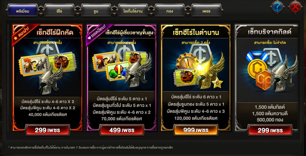 ิิิ เข้ามาดูในส่วนแรกกันเลยที่เห็นกันง่ายๆ หาแต้มมาง่ายๆ อย่างซื้อแพ็คเกจในร้านค้า เมื่อเปิดร้านค้ามาก็จะพบกับในส่วนพรีเมี่ยมซึ่งก็จะมีโปรแพ็คเกจน่าซื้อต่างๆ หลากหลายราคาและที่สำคัญมันได้แต้มเกียรติยศด้วยล่ะ อย่างแพ็คเกจถูกๆซื้อง่ายๆขวัญใจมหาชน ก็ต้องเป็นเซ็ตฮีโร่ฝึกหัดเลย ซึ่งเซ็ตนี้จะได้แต้มเกียรติยศถึง 40,000 แต้มเลยทีเดียว สามารถนำมาใช้สอยในส่วนต่างๆที่เกี่ยวกับรูนได้พอสมควรเลยในช่วงเริ่มต้น ส่วนถัดมาจะเป็นเซ็ตฮีโร่ผู้เชี่ยวชาญขั้นสูง เซ็ตนี้ก็จะมอบแต้มเกียรติยศให้ 70,000 แต้มด้วยกัน และมาดูเซ็ตสุดท้ายกัน เซ็ตนี้ซื้อครั้งเดียวจบได้เลย แต่ถ้าใครกระเป๋าหนักหน่อยก็จัดไปเลยซื้อซ้ำ 3 เซ็ต เซ็ตนี้จะได้แต้มเกียรติยศหนักมากอัดเต็มเลยทีเดียว 120,000 แต้ม