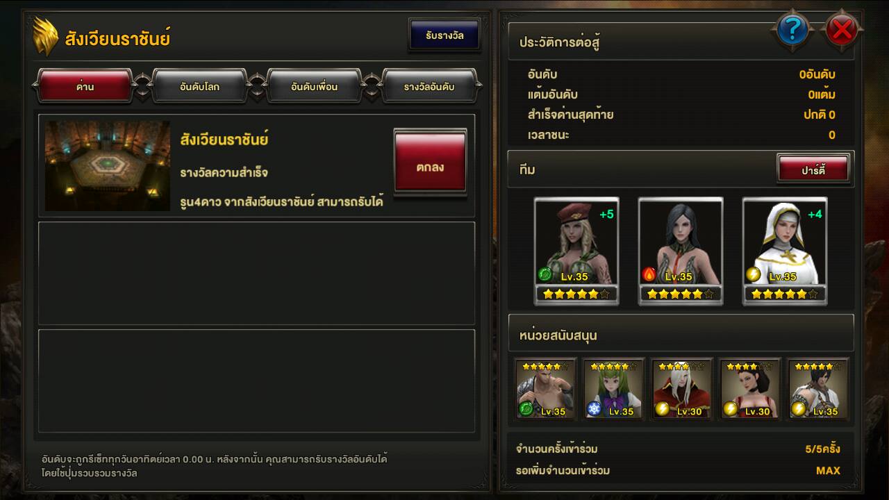 ต่อยาวๆกันเลยที่ "สังเวียนราชันย์" โหมดนี้ก็จำเป็นต้องเข้ามาบ่อยๆเหมือนกันในทุกๆครั้งที่ จำนวนครั้งเข้าร่วมเต็ม เพื่อที่จะเก็บคะแนนไปให้ได้มากที่สุดและของรางวัลที่จะได้ในแต่ละ Stage อีกด้วย ส่วนจำนวนครั้งในการเข้าร่วมนั้นจะเต็มอยู่ที่ 5 ครั้ง ใช้เวลารีต่อครั้ง 30 นาที สรุปจะรอรี 5 ครั้งก็ต้องรอเวลา 150 นาทีหรือ 2 ชั่วโมงครึ่ง นั่นเองครับ!