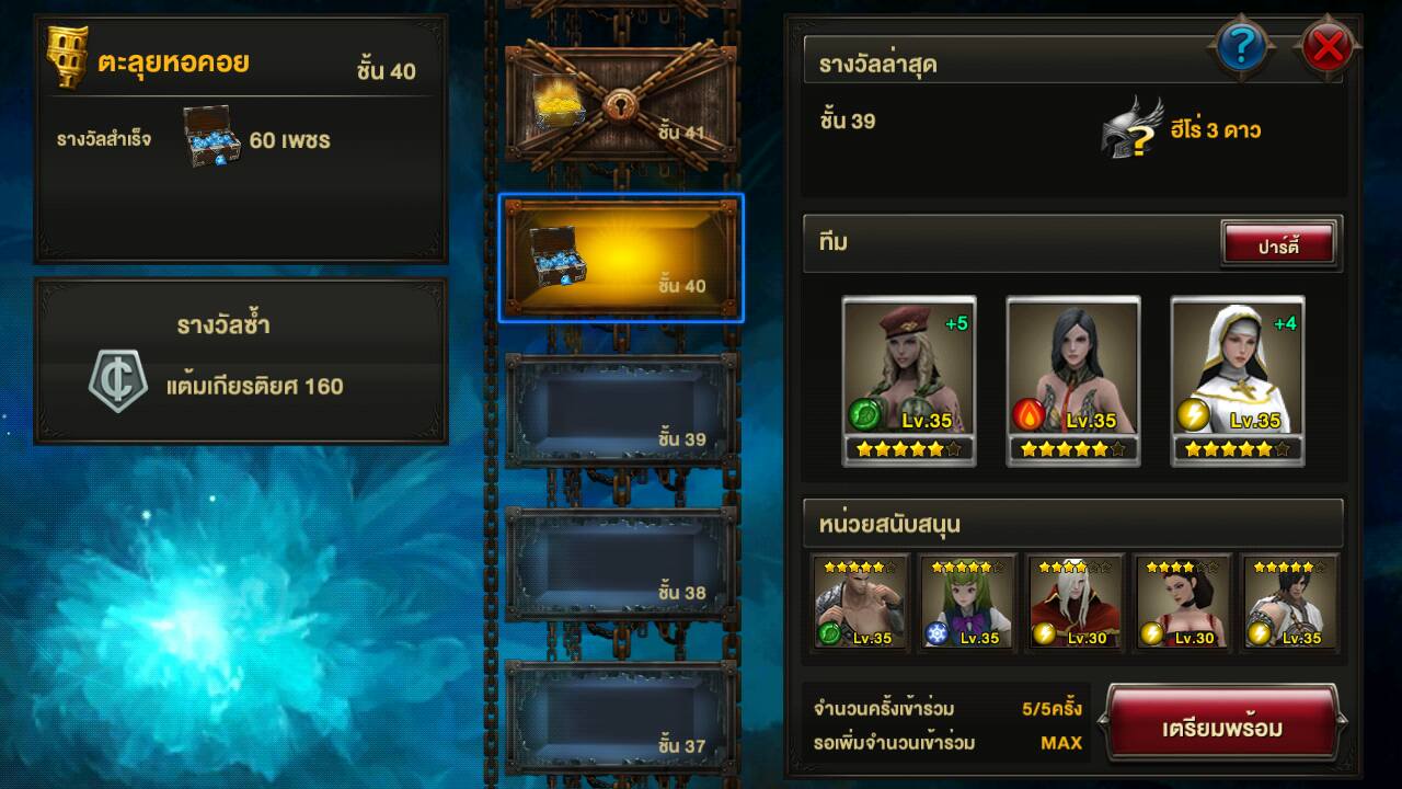 พลังงานเหลือเฟือครับผม ทำไรดี มานี่ซิไอหนุ่ม!! ถ้าหากคุณทำเควสสะสมฮีโร่ด้านบนไปแล้วหรือยังทำไม่สำเร็จก็ตาม แต่คุณก็สามารถทำเควสนี้ไปได้ด้วย นั่นก็คือ เควสเก็บเลเวลฮีโร่ให้เวลเต็มก็รับไปเลยเพชรและทอง จำนวนหนึ่งจ้า เควสนี้สามารถทำควบคู่ไปกับเควสอย่างอื่นได้ เพียงขอให้มีตัวหลักที่โหดพอ เก่งพอ ที่จะยืนถึกพร้อมทำดาเมจไปด้วยได้แบบไม่ตาย แล้วให้เรานำตัวเด็กที่เลเวลยังไม่เต็ม Max มาวางไว้ในช่อง 2 และ 3 เพียงแค่นี้ก็ตะลุยด่านไปครับ เน้นด่านที่คิดว่าให้ exp มากที่สุดและเก็บเลเวลตัวเด็กไวที่สุด