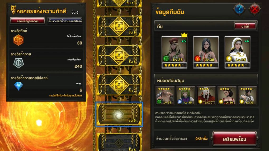 เข้ามาช่วยเหลือกิลด์ทุกวันใน "หอคอยแห่งความภักดี" บ้าง จงอย่าลืมเชียวนะ ว่าเมื่อมีสมาคมกิลด์แล้ว ก็จงอย่าอยู่กินฟรีไปวันๆ ควรจะมาช่วยเหลือเพื่อนร่วมสมาคมและเพื่อตัวเราเองด้วยในการ ออกไปสู้หอคอยนี้ให้ผ่านไปในแต่ละชั้น ซึ่งนอกจากจะได้ของรางวัลเมื่อเข้าไปเล่นแล้ว ในแต่ละสัปดาห์ยังมีรางวัลเป็นเพชรที่จะมอบให้ตามจำนวนชั้นที่พิชิตได้อีกด้วย!! ส่วนโหมดนี้จะสามารถเข้าได้เพียง 2 ครั้งต่อวันเท่านั้นครับ....