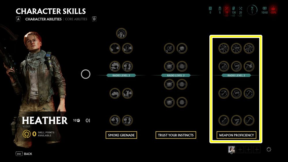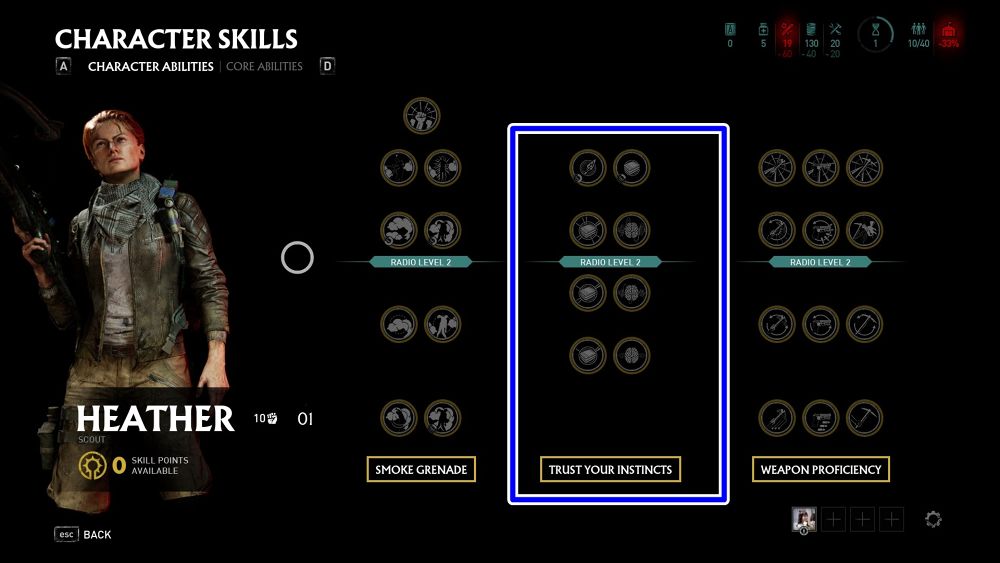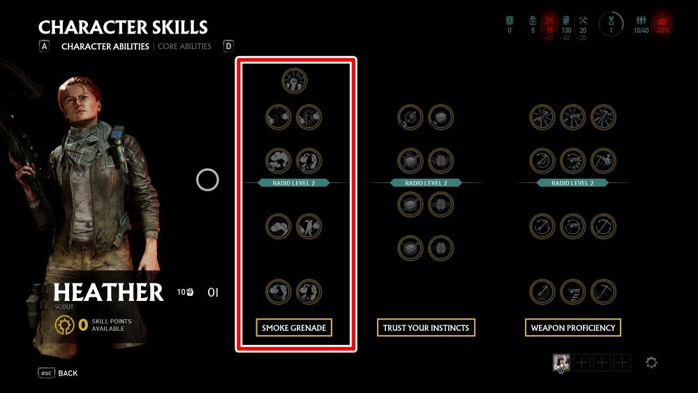 สกิลของเธอจะแบ่งออกเป็น 3 สายนั่นคือ Smoke Grenade สำหรับพัฒนาความสามารถของระเบิดควัน , Trust Your Instinct สำหรับเพิ่มความสามารถในการมองหากับดักและสิ่งของในฉาก , Weapon Proficiency เพิ่มความชำนาญของการใช้อาวุธทั้ง 3 ประเภท รายละเอียดสกิลมีดังนี้เรียงจากแถวล่างสุด ซ้ายไปขวา ขึ้นมาด้านบนตามลำดับ- Cloud Cover : ใช้ Skill Point 2 แต้มในการอัพ