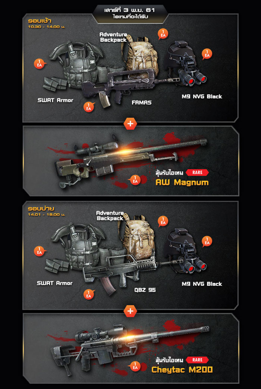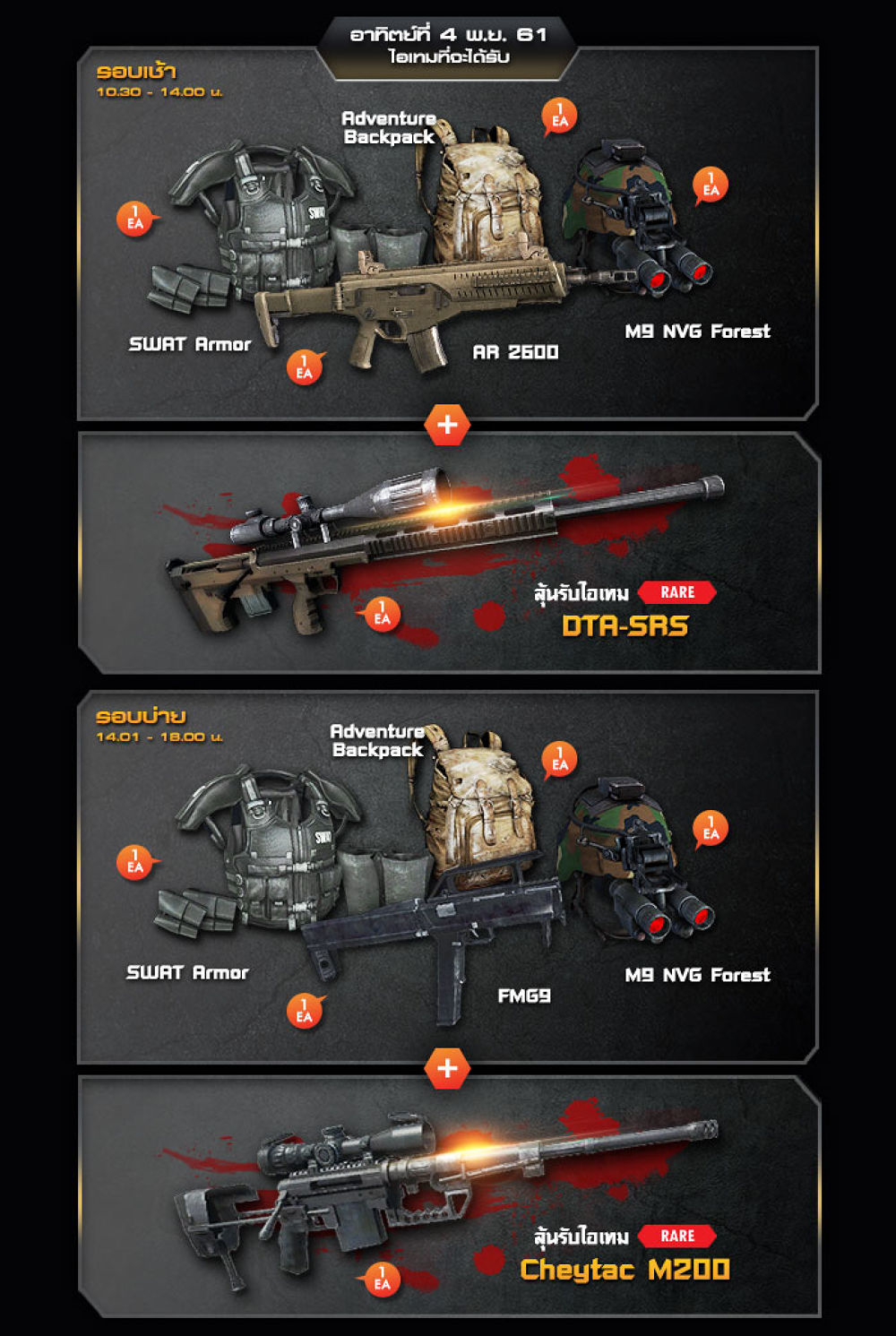- สงวนสิทธิ์ 1 ID รับไอเทมได้ 1 ครั้ง / รอบเท่านั้น (1 วันรับได้สูงสุด 2 รอบ)