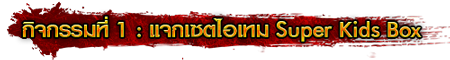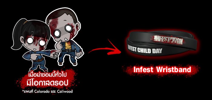► แจกเซตไอเทมสุดพิเศษให้กับทุกๆไอดี ที่มีการล็อกอินเข้าเล่นเกม Infestation Thailand ในช่วงเทศกาลวันเด็ก ตั้งแต่วันที่ 8 มกราคม 2562 เวลา 14.00 น. - วันที่ 15 มกราคม 2562 เวลา 10.00 น. รับเซตไอเทม Super Kids Box ฟรี! เป็นของขวัญสุดพิเศษมอบให้จากพี่บี้ แจกไอดีละ 1 เซต เข้าคลังกลาง Global Inventory ภายในเกมโดยอัตโนมัติทันที