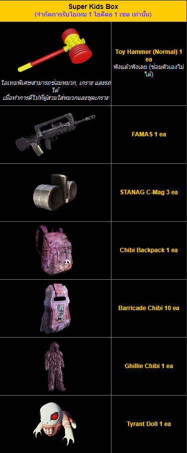 ► เพิ่มเซตไอเทมสุดพิเศษฉลองวันเด็ก ดรอปกับซอมบี้ทั่วไป, บอส Super Zombie และ Tyrant ซึ่งมีรายละเอียดในการตามหาดังนี้