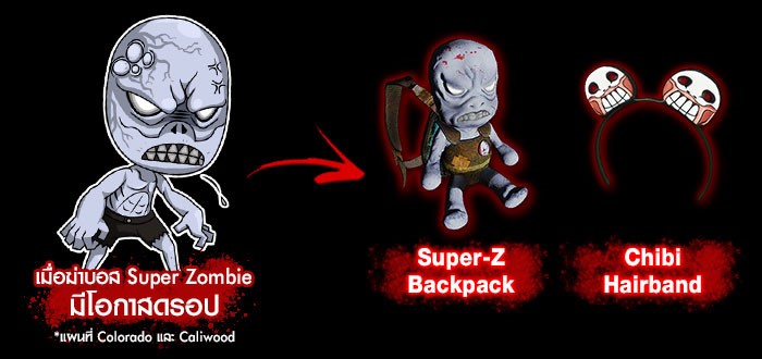 เมื่อฆ่าบอส Super Zombie แผนที่ Colorado และ Caliwood มีโอกาสได้รับไอเทม Super-Z Backpack และ Chibi Hairband