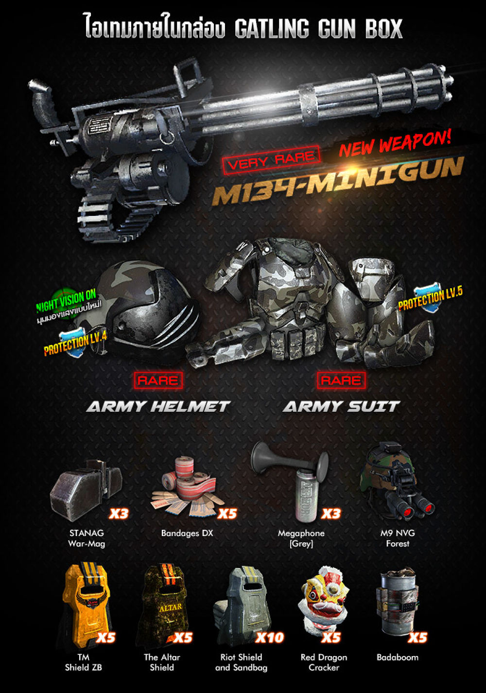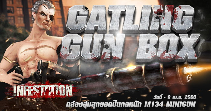 Infestation นำส่งกล่องสุ่มอาวุธใหม่ สุดยอดปืนกลหนัก ประเภท Gatling Machine Gun " M134 MINIGUN " ที่มาพร้อมกับระบบการยิงรูปแบบใหม่เฉพาะตัวของปืนกระบอกนี้! ด้วยพลังอานุภาพความโหด จึงได้รับสมญานามว่า " รัว ลั่น จักรสังหาร " เปิดให้พิสูจน์ความโหดของปืนกลประจัญบานพร้อมๆกัน วันนี้! เพียงครั้งละ 100 GC เท่านั้น ห้ามพลาด!