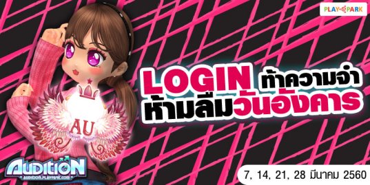 AUDITION เกมแดนซ์ออนไลน์สุดฮิตอันดับ 1 ของเมืองไทย ชวนทบทวนความจำกับกิจกรรม “LOGIN ท้าความจำ ห้ามลืมวันอังคาร” เพียงแค่อย่าลืมล็อกอินเข้าเกมทุกวันอังคารตลอดเดือนมีนาคมนี้ ก็รับไปเลยฟรีๆ ไอเทมปีกสุดคูล ระยะเวลา 30 วัน และที่พิเศษสุดๆ ถ้าเพื่อนๆ LOGIN ครบทุกวันอังคารทั้งเดือน รับระยะเวลาไอเทมเพิ่มอีก 1 ปี กิจกรรมสุดง่าย ได้ไอเทมสุดแรร์ ห้ามพลาดนะจ๊ะ รายละเอียดเพิ่มเติม (อ่านที่นี่)