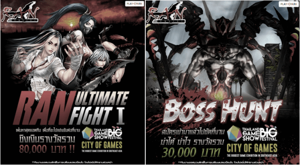 • Ran Ultimate Fight I – สุดยอดทีมของ 2 เซิร์ฟเวอร์จากรอบออนไลน์ จะมาแบทเทิ้ลภายในงาน TGS ชิงเงินรางวัลรวม 80,000 บาท โดยการแข่งจะวัดกันแบบ Party PVP 5 VS 5 เพื่อชิงความเป็นหนึ่งของ RAN Online รายละเอียดเพิ่มเติม http://bit.ly/RAN-UltimateFlight