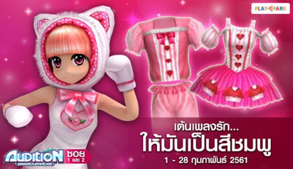 AUDITION เกมแดนซ์ออนไลน์สุดฮิต ขนขบวนกิจกรรมต้อนรับเดือนแห่งความรักกับกิจกรรม 3 Step Love ให้เพื่อนๆได้โอกาสหาคู่รักและแต่งงานในวันที่ 8 กุมภาพันธ์ รับไอเทมแรร์ไปเลย! ตั้งแต่วันนี้ – 28 กุมภาพันธ์ รายละเอียดกิจกรรม (คลิกที่นี่) รวมถึง กิจกรรม ล็อกอินเดือนนี้รับแรร์ถาวร และ เต้นเพลงรัก…ให้มันเป็นสีชมพู ทั้ง 2 กิจกรรม สามารถร่วมสนุกได้ตลอดเดือนกุมภาพันธ์ และ ยังมีอีกกิจกรรมมาให้เพื่อนๆได้ร่วมกัน กิจกรรม ประกวดออกแบบเสื้อคู่รัก ใครชนะรับรางวัลและไอเทมสุดคิวท์ไปเลย ตั้งแต่ 14 กุมภาพันธ์ - 1 มีนาคมนี้