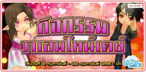 Luna X Online ตำนานเกมสุดแบ๊ว จาก PLAYPARK.COM พบกับกิจกรรม วาเลนไทน์รวม 3กิจกรรมต้อนรับเดือนแห่งความรัก ไม่ว่าจะเป็นกิจกรรม กำจัดมอนสเตอร์เพื่อรับตัวอักษร LOVE , กิจกรรม ล๊อกอินวันวาเลนไทน์!! และ คูณ2 มันส์สนุกรับวาเลนไทน์!! เริ่มตั้งแต่วันที8 – 22 กุมภาพันธ์นี้เท่านั้น นอกจากนี้ยังมีอี่กหนึ่งกิจกรรมสำหรับ ต้อนรับผู้เล่นใหม่!! เพียงแค่ผู้เล่นที่สร้างไอดีจะได้รับ BlueChip จำนวน 10,000 และไอเทมของรางวัลอีกมากมาย กิจกรรมเริ่มตั้งแต่วันนี้เป็นต้นไป
