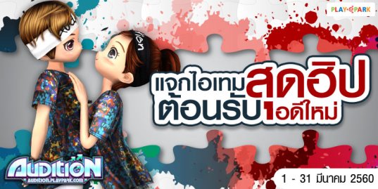 Audition เกมแดนซ์ออนไลน์สุดฮิตอันดับ 1 ของเมืองไทย มาแจกกันรัวๆ กับไอเทมสุดฮิปเพียงแค่สมัครไอดีใหม่ และสร้างตัวละครเกม Audition ก็รับไปเลยฟรีๆ ไอเทมยกเซ็ตระยะเวลา 30 วัน แต่ถ้าเล่นถึงเลเวล6 ในช่วงระยะเวลากิจกรรม ก็สามารถมากดรับไอเทมยกเซ็ท ระยะเวลาถาวร ไปได้เลย กิจกรรมตั้งแต่วันนี้ – 31 มีนาคม 2560 รายละเอียดเพิ่มเติม (อ่านที่นี่)