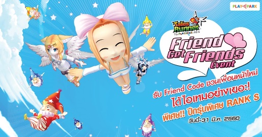 Tales Runner เกมวิ่งแข่งอันดับหนึ่งของไทย มาร่วมชวนเพื่อนๆ ไปสนุกกันกับกิจกรรม Friend Get Friends รับ Friend Code เพียงชวนเพื่อนของคุณมาวิ่งด้วยกัน แล้วถ้าถึงเงื่อนไขตามที่กำหนด ก็รับ Friend Point สะสมเพื่อไปแลกไอเทมสุดพิเศษกันเลยฟรีๆ!! ยิ่งชวนมาก ยิ่งมีสิทธิ์มากนะ สามารถร่วมกิจกรรมได้ตั้งแต่วันนี้ - 31 มีนาคม 2560 รายละเอียดเพิ่มเติม (อ่านที่นี่)