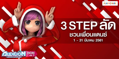 Audition เกมแดนซ์ออนไลน์สุดฮิต ขอเชิญชวนเหล่าขาแดนซ์ ร่วมกิจกรรม 3 STEP ลัด ชวนเพื่อนแดนซ์ ง่ายๆเพียง 3 Step ทางลัดรับไอเทมฟรีระยะเวลาสูงสุดถาวรกันไปเลย STEP 1 แคปรูปอะไรก็ได้ที่อยู่ในเกมออดิชั่น STEP 2 เพียงชวนเพื่อนๆ หรือชาวแก๊งมาเล่นออดิชั่นตั้งแต่ 1-5 คนขึ้น และช่วยเหลือให้เพื่อนๆเลเวลอัพไปถึงเวล 5 ขึ้นไป STEP 3 รอรับไอเทมที่ถือสุดคิวท์ไปถือเลยฟรีๆ! ตั้งแต่วันนี้ – 31 มีนาคม 2561 อ่านรายละเอียดกิจกรรมเพิ่มเติม คลิกที่นี่