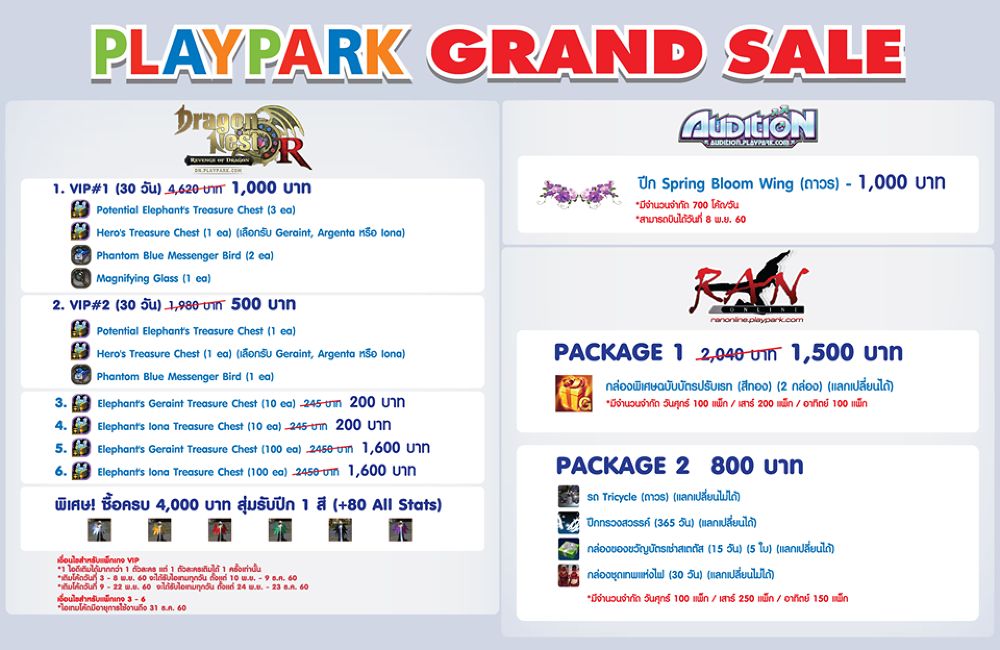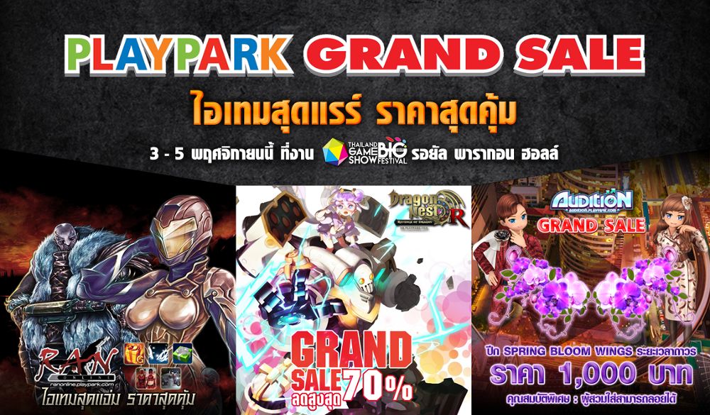 PLAYPARK.COM ในเครือเอเชียซอฟท์ฯ เอาใจนักช้อปสายเปย์ ไม่ว่าจะเป็น นักเรียน นักรบ หรือขาแดนซ์ทั้งหลายห้ามพลาดเด็ดขาด!! พบกับบูธ PLAYPARK ที่ขนไอเทมมาจัด GRAND SALE โดยมีสินค้ามากมาย จาก 3 เกมดัง Dragon Nest, Audition และ Ran Online ฟินกับไอเทมสุดแรร์ ที่มาพร้อมแพ็คเกจสุดคุ้มในราคาที่พิเศษสุดๆ