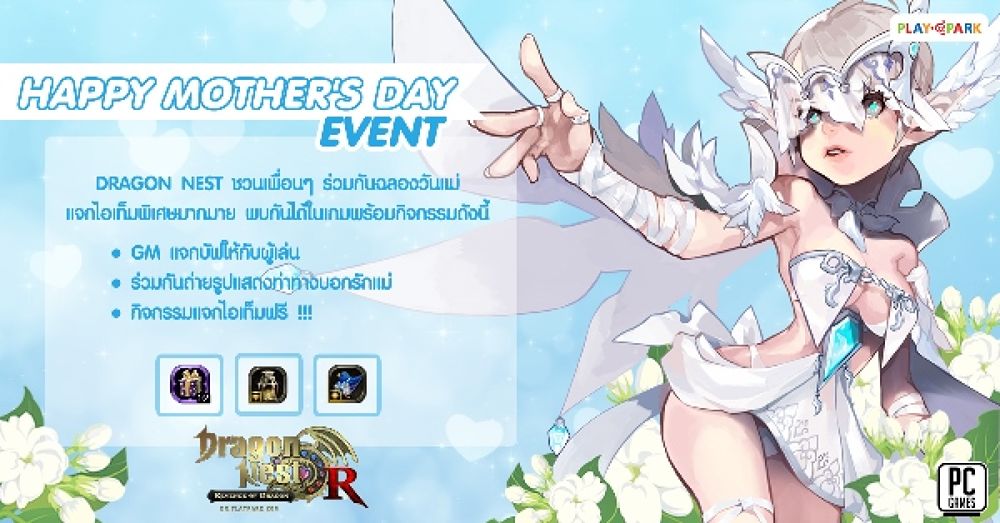 DragonNest ขอร่วมเฉลิมฉลองวันแม่แห่งชาติด้วย กิจกรรม Dragon Nest Love Mom ซึ่งทาง GM ในเกมจะลงไปแจกบัฟให้กับผู้เล่นทุกคน และร่วมถ่ายภาพกับ GM โดยแสดงท่าทางหรือข้อความบอกรักแม่พร้อมรับไอเทมฟรี ภายในวันอาทิตย์ที่ 12 สิงหาคม 2561  เวลา 19.00 - 20.00 และยัง มีกิจกรรมใน แฟจเพจ ถ่ายทอดความรู้สึกจากในเกมสู่นอกเกมแคปภาพที่ร่วมถ่ายกับ GM โดยแสดงท่าทางหรือข้อความบอกรักแม่ภายในเกมมาโพสต์ใต้กิจกรรมแฟนเพจ ลุ้นรับไอเทม ภายในวันที่ 12 – 13 สิงหาคม 2561 เท่านั้น สามารถติดตามรายละเอียดกิจกรรมในเกม Dragon Nest ได้ที่เพจ Dragon Nest Thailand