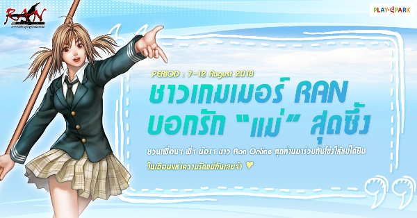 RAN Online สังเวียนเดือด ศึกสามสถาบัน  ชวนพี่ๆน้องๆ ชาว RAN  มาบอกรักแม่สุดซึ้ง กับภารกิจโข่งรักแม่ เชิญชวนเพื่อนๆ ทุกคนมาร่วมใจกันบอกรักแม่ ให่ครบ 9,999 ข้อความ เพื่อที่ภารกิจ จึงจะสำเร็จ โดยถ้าภารกิจสำเร็จ รับไอเทมยกเซิฟเวอร์ !! เริ่มแล้วตั้งแต่วันนี้ - 12 สิงหาคม 2561 เท่านั้น และ ในวันที่ 9 สิงหาคม เวลา 15.00 น.  มีการแจกเสื้อรักแม่ ให้กับผู้เล่นทุกไอดี รายละเอียดเพิ่มเติม (คลิกที่นี่)