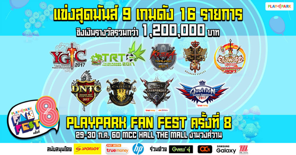 เรียกได้ว่าแต่ละการแข่งขัน ถือเป็นอีกหนึ่งไฮไลท์สำคัญของงานนี้ จงเตรียมตัวกันมาให้พร้อมแล้วมาร่วมเป็นส่วนหนึ่งของการค้นหาแชมป์ระดับประเทศ ร่วมลุ้น ร่วมเชียร์กัน ว่าใครจะได้ครองแชมป์ในปี 2017 เป็นสุดยอดเกมเมอร์ตัวจริง เจอกันที่ PLAYPARK Fan Fest ครั้งที่ 8 วันที่ 29-30 กรกฎาคมนี้ ที่ MCC Hall เดอะมอลล์ งามวงศ์วาน