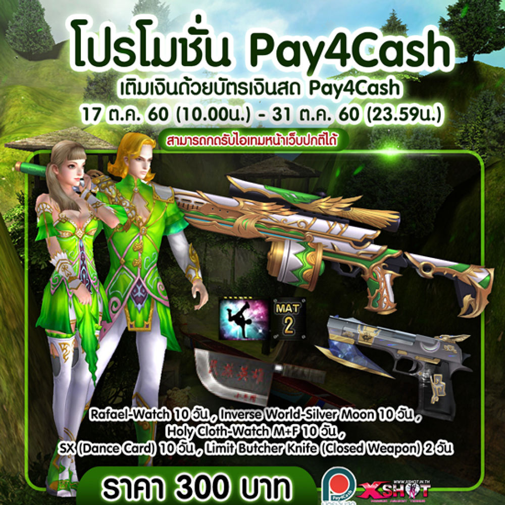 Xshot จาก Winner Online ร่วมกับบัตรเงินสด Pay4Cash แจกไอเทมสุดปัง! เพียงแค่เพื่อนๆ เติมเงินโดยใช้บัตรเงินสด Pay4Cash ราคา 300 บาท ก็รับไปเลยไอเทมสุดพิเศษ! งานนี้ใครรอมีดหมูอยู่บอกเลยว่าอย่าช้า เท่านั้นยังไม่พอ!! เพื่อนๆ ยังสามารถกดรับโปรหน้าเว็บขั้น 300 บาท ได้อีกด้วยนะ!