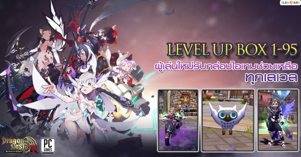 DragonNest R ได้เผยไอเทมจากกล่องเลเวล1 - 95 สร้างตัวละครวันนี้ รับกล่อง Level ทันที!!! พิเศษ!เปิดขายไอเทมชิ้นใหม่ Jumping Potion LV.95 และพิเศษอีกขั้นรับไอเทมระดับLegend ง่ายๆ เพียงซื้อ Advance Newbie Package รายละเอียดเพิ่มเติม (คลิ๊กที่นี่)พร้อมด้วยกิจกรรม Goddess Bonus Timeวันจันทร์ - ศุกร์ EXP +50% | วันเสาร์และอาทิตย์ EXP +สูงสุด 200% พิเศษทุกวันอาทิตย์ รายละเอียกเพิ่มเติม(คลิ๊กที่นี่)และ Daily Login Reward! & Achievement Reward กิจกรรมประจำเดือนกันยายนเพียงแค่ล็อคอินเข้าเกมและร่วมทำภารกิจที่กำหนดไว้ให้สำเร็จ รับของรางวัลมากมาย รายละเอียดเพิ่มเติม (คลิ๊กที่นี่)