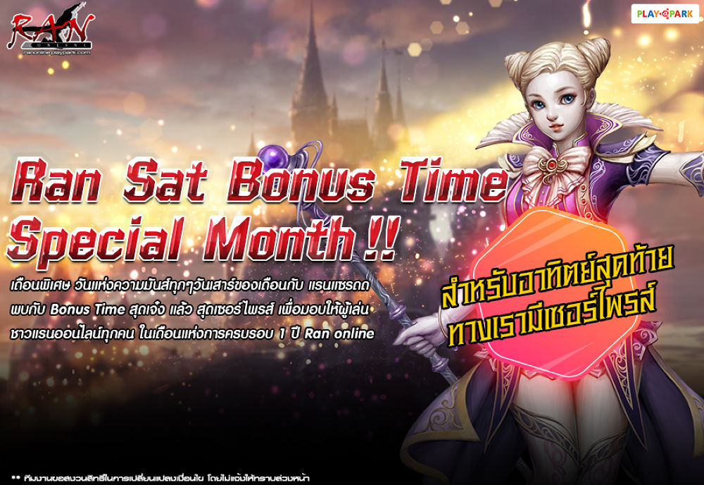 RAN Online สังเวียนเดือดศึกสามสถาบัน เดือนพิเศษวันแห่งความมันส์ทุกวันเสาร์กับแรนแซรดด พบกับ Bonus Time สุดเจ๋ง เพื่อมอบให้ผู้เล่นชาวแรนออนไลน์ทุกคนในเดือนแห่งการครบรอบ 1 ปี RAN Online วันนี้- 30 กันยายน 2561 รายละเอียดเพิ่มเติม(คลิ๊กที่นี่)