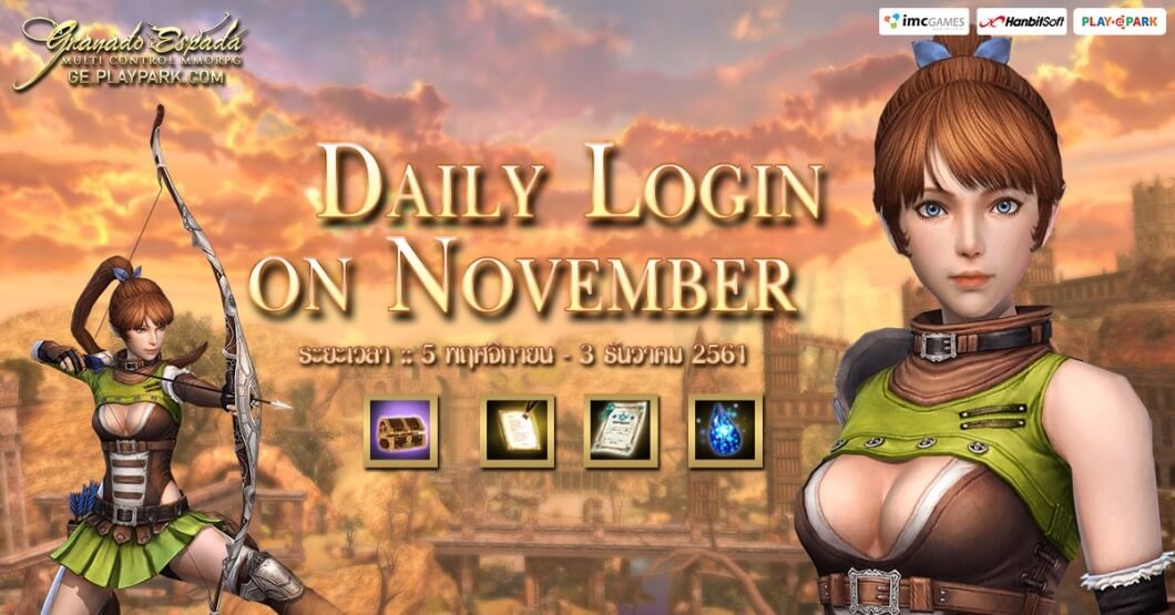 Granado Espada เกมของคนจริง ที่สุดแห่ง MMORPG สไตล์ยุโรป พบกับกิจกรรม Daily Login on November แจกตัวละครฟรีๆกันแบบต่อเนื่อง เดือนนี้ถึงคิวนักล่าสาวสายคิ้วท์ Sesilเพียงแค่เข้าเกม GE ตั้งแต่วันนี้ 3 ธันวาคม 2561 รับไอเทมไปเลย!!รายละเอียดเพิ่มเติม (คลิกที่นี่) และกิจกรรม HALLOWEEN PARTY 2018ตามหาฟักทองฮาโลวีนที่หายไปให้น้องเดซี่กลับมาปีนี้น้องเดซี่ขนของรางวัลมาให้แลกแบบเยอะมากเว่อร์สายแฟนชั่นพลาดแล้วจะเสียใจนะจ๊ะ!! วันนี้ 19 พฤศจิกายน2561 รายละเอียดเพิ่มเติม (คลิกที่นี่)
