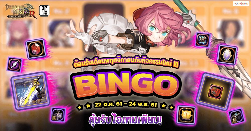 Dragon Nest R เกม Action 3D  ต้อนรับพฤศจิกายนกับ Bingo Event สนุกสุดมันส์รับของรางวัลเพียบ เพียงเคลียร์ภารกิจออนไลน์ให้ครบ 4 ชั่วโมงและลง Labyrinth 5 รอบ รับเหรียญ Bingo เพื่อนำไปแลกไอเท็มได้มากมาย ตั้งแต่วันนี้– 24 พฤศจิกายน 2561 (คลิกที่นี่)