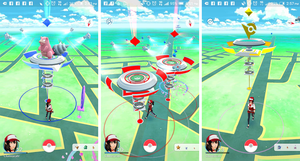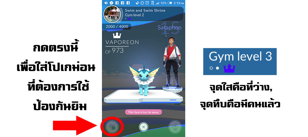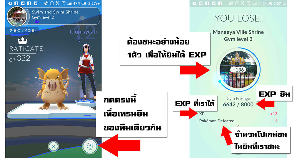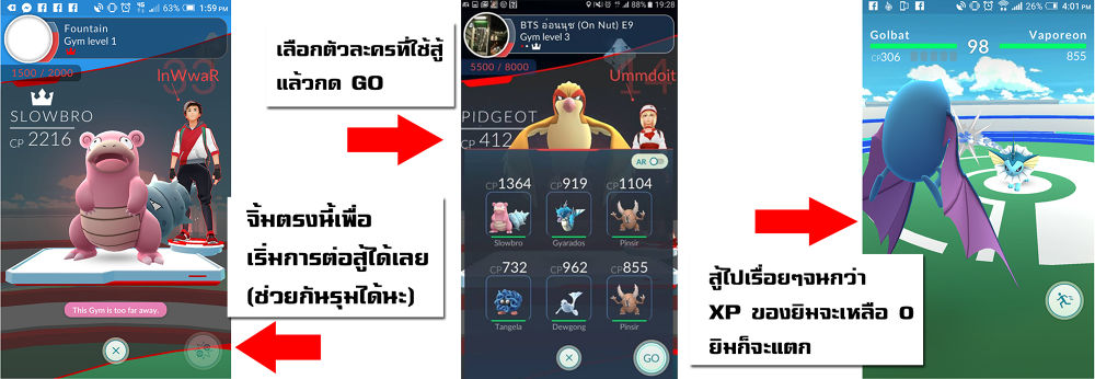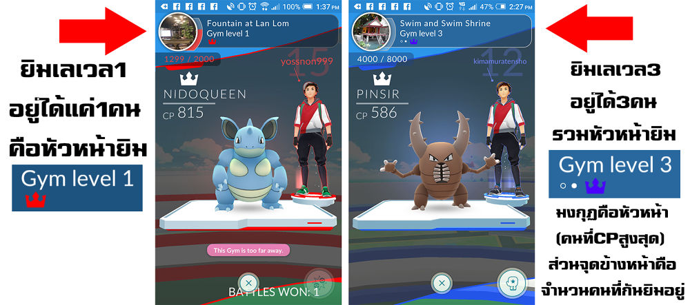 Gym หรือ ยิม จะเป็นเสาใหญ่ๆ สูงๆ ที่มีโปเกม่อนอยู่ข้างบน บ่งบอกว่าโปเกม่อนตัวไหนครองยิมอยู่ สีของยิมจะขึ้นอยู่กับว่าทีมไหนเป็นเจ้าของยิม ยกตัวอย่างเช่น ยิมสีแดงเสาก็จะสีแดง ยิมสีฟ้าเสาก็จะเป็นสีฟ้า แต่ถ้าเป็นสีเทาแปลว่ายิมว่าง ไม่มีใครครองอยู่ เราสามารถเข้าไปยึดได้เลยอย่างแรกเลยก็คือ เราจะต้องมีเลเวล 5 ขึ้นไปซะก่อน พอเวล 5 แล้วให้กดที่ยิมไหนก็ได้ (ไม่ต้องเข้าไปใกล้ก็ได้) แล้วดอกเตอร์จะโผล่มาพร้อมให้กับเราเลือกทีมที่ต้องการอยู่ ทีมแต่ละทีมแตกต่างกันยังไง [[ อ่านที่นี่ ]] แค่นี้เราก็สามารถตียิมได้แล้วค่า Pokecoins ไงจะอะไรล่ะ!! ถ้าเรายึดยิมได้ สิ่งที่เราจะได้ก็คือ Pokecoins เหรียญที่เอาไว้ใช้ซื้อไอเทมใน Shop นั่นเอง ยิ่งยึดได้หลายยิมก็จะได้เหรียญมากขึ้นไปด้วยนะ ยึดแล้วได้กี่เหรียญ รับเหรียญยังไง มาอ่านกันที่หัวข้อต่อไปเลยค่า วิธีตียิมมีหลายแบบ ทั้งตีสีเดียวกัน และสีตรงข้าม ดังนี้► Defend a Gym (ช่วยป้องกันยิมสีเดียวกัน)การที่จะป้องกันยิมสีเดียวกันนั้น ในยิมจะต้องมีที่ว่างให้เราซะก่อน ซึ่งจำนวนคนที่สามารถช่วยกันป้องกันยิมได้นั้นจะขึ้นอยู่กับเลเวลของยิม ยกตัวอย่างเช่น ยิมเลเวล 6 ก็จะมีคนอยู่ในยิมได้ 6 คน (นับหัวหน้ายิมด้วย) นั่นเอง ถ้ายิมว่างให้เราเอาตัวใส่ ก็จะขึ้น ไอคอน (+) อยู่ซ้ายล่างของจอ ถ้าเข้ายิมไหนแล้วสามารถกดเพิ่มโปเกม่อนไปกันยิมได้ล่ะก็ รีบกดเลยนะก่อนที่จะโดนเเย่ง! คนที่ขึ้นเป็นหัวหน้ายิม (มีมงกุฏ) ก็คือคนที่ CP เยอะที่สุด ถ้าตอนแรกเรามีมงกุฏ แต่มีคนที่ CP เยอะกว่าเราเข้ามา คนคนนั้นจะกลายเป็นหัวหน้ายิมแทน ดังนั้นตำแหน่งในยิมจะเรียงจากคนที่มี CP น้อยที่สุดไปจนถึงคนที่มี CP เยอะที่สุดนั่นเอง► เพิ่มเลเวลยิมของสีเดียวกัน ทำยังไง?วิธีเพิ่มเลเวลยิมสีเดียวกันก็คือ การตีกันเองนี่แหละ! เมื่อเราเข้าไปที่ยิมของสีเดียวกัน ที่มุมขวาล่างจะมีรูปนวมอยู่ ซึ่งก็คือการช่วยเทรนยิมให้แข็งแกร่งยิ่งขึ้นนั่นเอง โดยเกมจะให้เราเลือกโปเกม่อน 1 ตัวเพื่อใช้ต่อสู้ แต่ก็มีเงื่อนไขอยู่นะ คือ เราต้องเอาชนะคนที่อยู่ในยิมให้ได้อย่างน้อย 1 คน ยิมถึงจะได้ EXP ถ้าสู้แล้วแพ้จะไม่ได้อะไรค่า ♦ ใครก็ได้ที่อยู่ทีมเดียวกันสามารถตียิมกันเองได้หมดเพื่ออัพเลเวลยิม ไม่ต้องกลัวว่ายิมจะพัง เพราะมันยึดทีมสีเดียวกันเองไม่ได้นะ ►Take over a Gym ( ตียิมของสีอื่นเพื่อยึด )กดที่ยิมที่เราต้องการจะตี ตรงมุมขวาจะขึ้นไอคอนให้เราท้าสู้ โดยเราจะเลือกโปเกม่อนที่ต้องการใช้สู้ได้ถึง 6 ตัว ซึ่งเทรนเนอร์หลายคนสามารถช่วยกันรุมตีได้ในเวลาเดียวกัน ถ้าเราจัด
